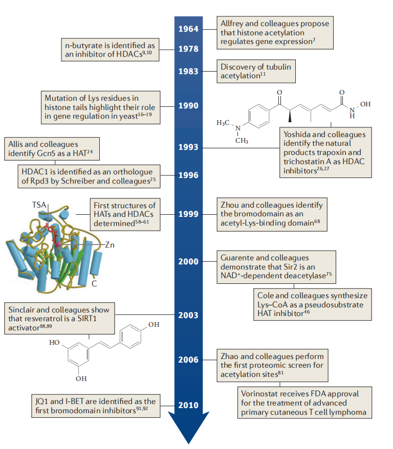 Vincent Allfrey 及其同事于1964年首次在组蛋白上发现了赖氨酸乙酰化修饰,并提出了这种蛋白修饰在转录调控中可能有作用。